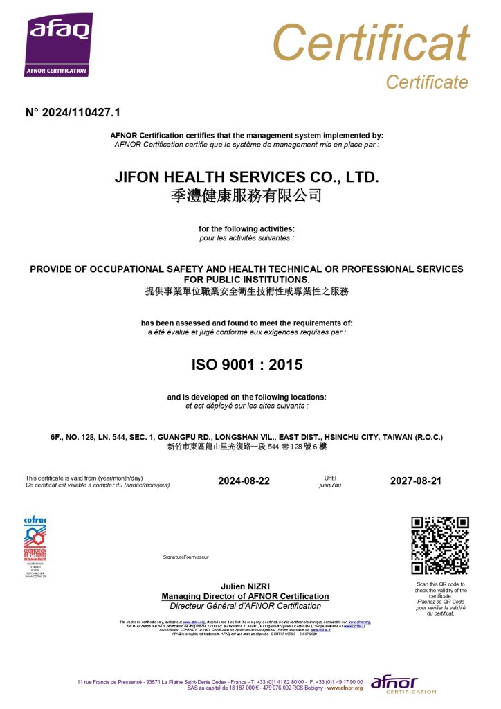 季灃已連續二年(113、114年度)榮獲職安署-勞工健康顧問服務類之顧問機構實地查核『甲等』等級,並於持續通過『ISO 9001國際品質管理系統』驗證及續評